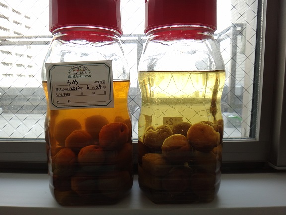 去年つくった梅酒です。 左が黒糖梅酒、右が普通の梅酒です。 黒糖梅酒はコクがあり、普通の梅酒はさっぱりとしています。 ロックや炭酸割りなどでおいしく飲んでいます^^